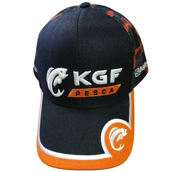 Boné KGF Pesca, confeccionado em 100% Poliéster, em tamanho único, telado na parte traseira e fechado na frente com bordado, com misto em cores preto, laranja e branco.