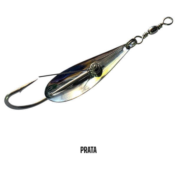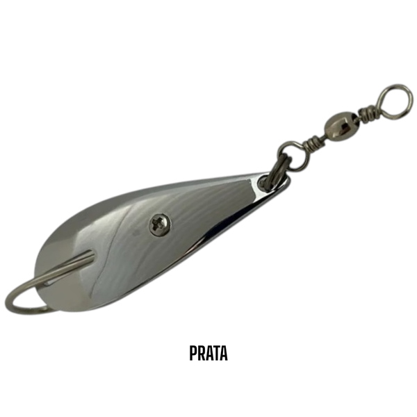 Uma Isca de meia água que também trabalha de fundo agindo com seu dispositivo em sua função anti-enrosco. Em seu trabalho Sinking, e uma isca artificial confeccionada em Latão, cromado, com anzol parafusado, e dispositivo anti-enrosco, com arame aço inox. Acompanha a isca Argola e Girador.
