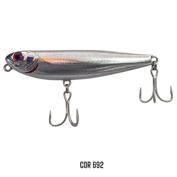 A ZipBaits Fakie Dog 70 é uma isca de superfície do tipo stick/zara desenvolvida para provocar ataques explosivos de predadores com seu nado preciso em "zig-zag" (walking the dog). Com 70mm de comprimento e pesando 8,2g, ela combina equilíbrio perfeito e aerodinâmica para longos arremessos, mesmo em condições de vento ou com equipamentos mais leves. Equipada com o exclusivo sistema Mag-Drive® da ZipBaits, a Fakie Dog 70 oferece estabilidade excepcional, melhora o desempenho nos arremessos e potencializa sua ação ao mínimo toque de ponta de vara. Seu design inclui detalhes em alto relevo, olhos 3D e acabamento de pintura premium, que simulam com fidelidade peixinhos feridos, irresistível para espécies como tucunaré, traíra, robalo, black bass e dourado. Outro diferencial está em sua parte frontal, com microbrânquias projetadas para criar bolhas e respingos sutis, aumentando o apelo visual mesmo em águas mais calmas. Isso faz dela uma excelente escolha para trabalhar em pontos de grande pressão de pesca ou quando o peixe está mais desconfiado.